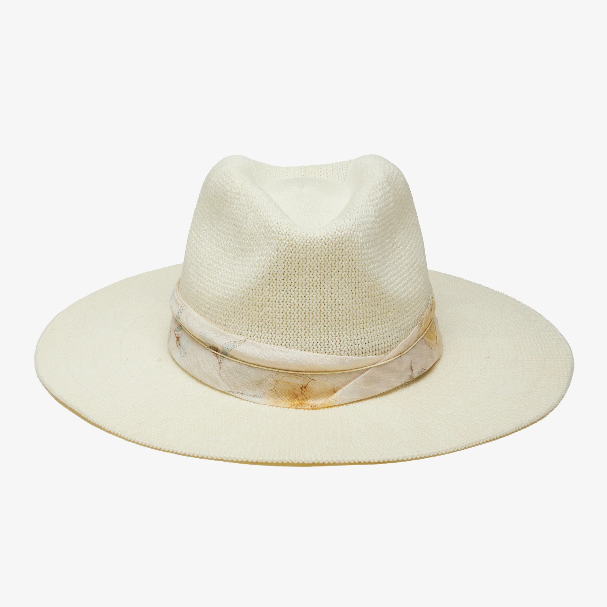 Our Corsica panama is trimmed with a floral print chiffon scarf and frosted beads on twine.