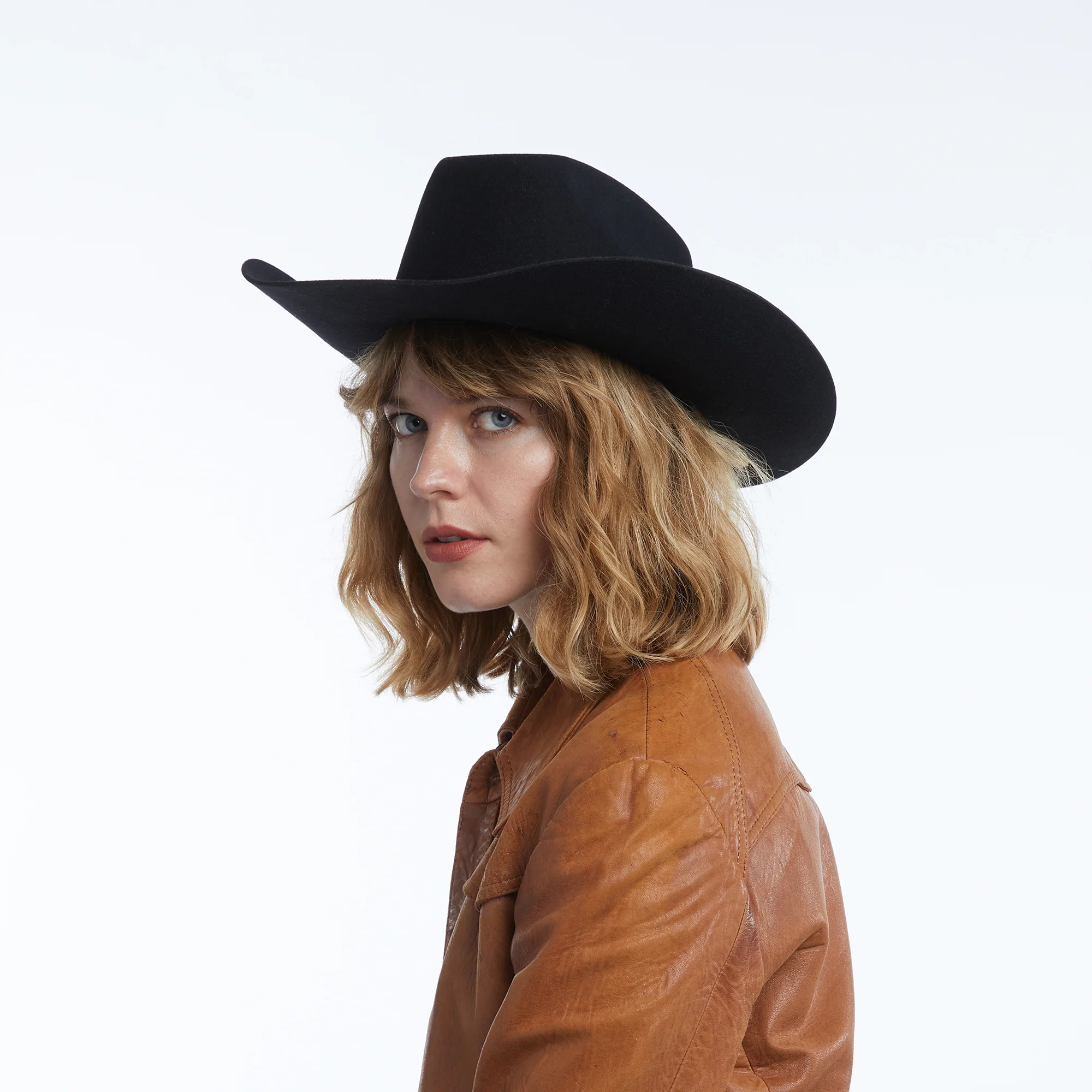 Stiff brim cowboy with leather belt and western conch and buckle.