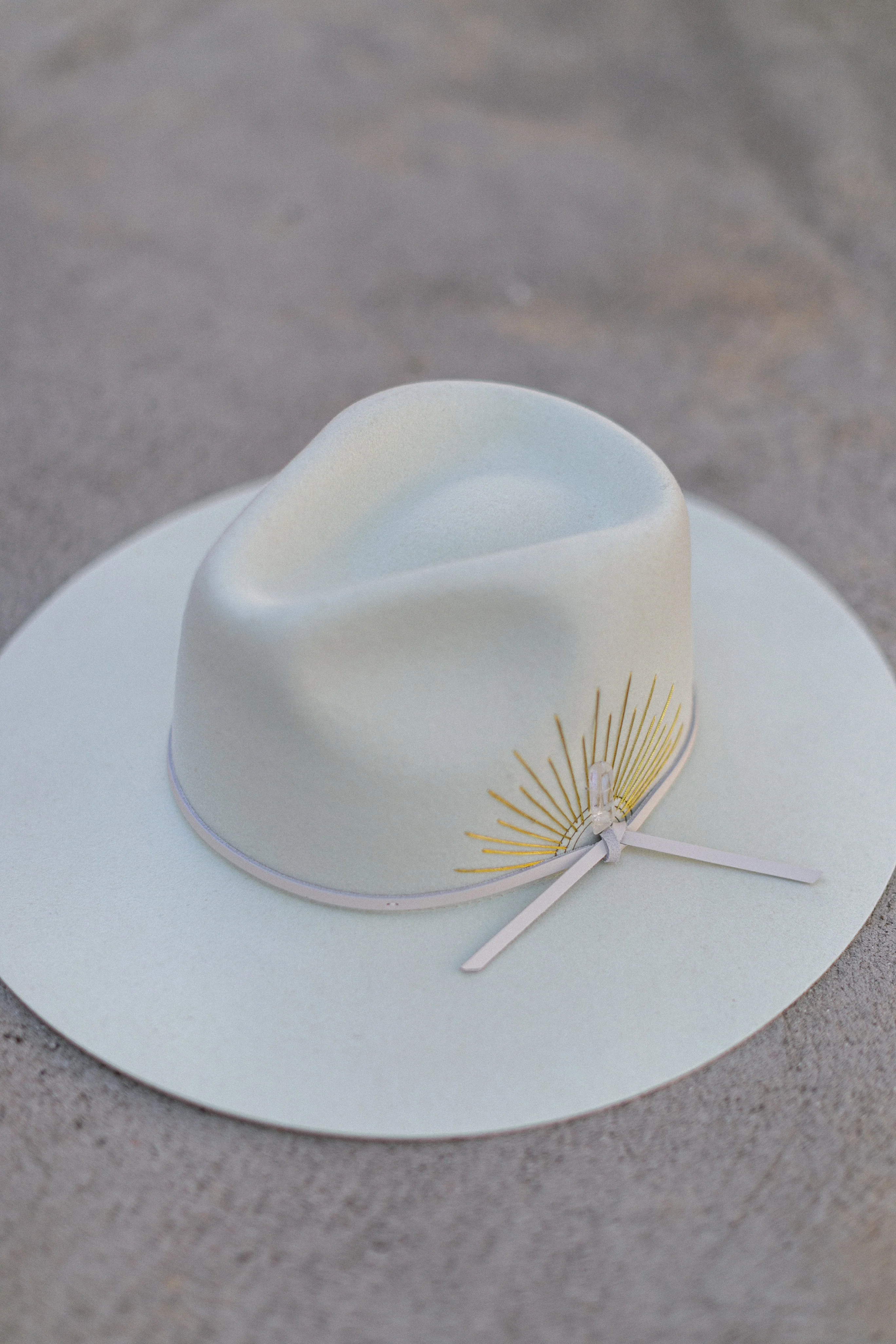 Could this hat be anymore dreamy? Made with Australian cashmere wool, this flat brim rancher is hand-stitched with sun embroidery, and accented with a genuine leather tie band and Selenite crystal. Swoon.